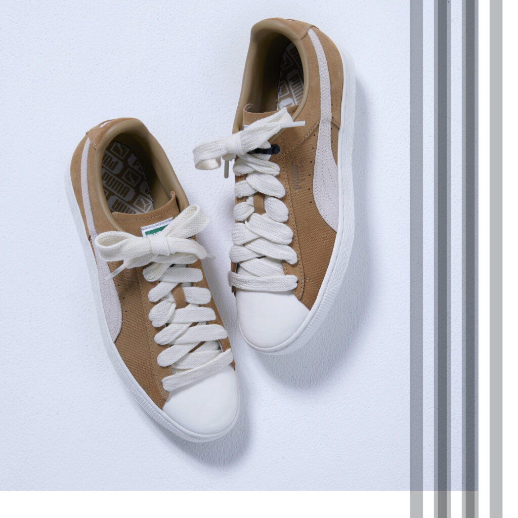 「スウェードや異素材のミックス、キャメルカラーが特徴。幅広のシューレースも気に入りました!スウェットパンツやニットパンツなど、ラフなものに合わせたい一足です。基本的にトーンを揃える着こなしが好き。インナーがホワイトでブラウンのアウターを羽織るコーデも合いそう。カーキなどアースカラーになじませて履きたいですね」(平沼さん)