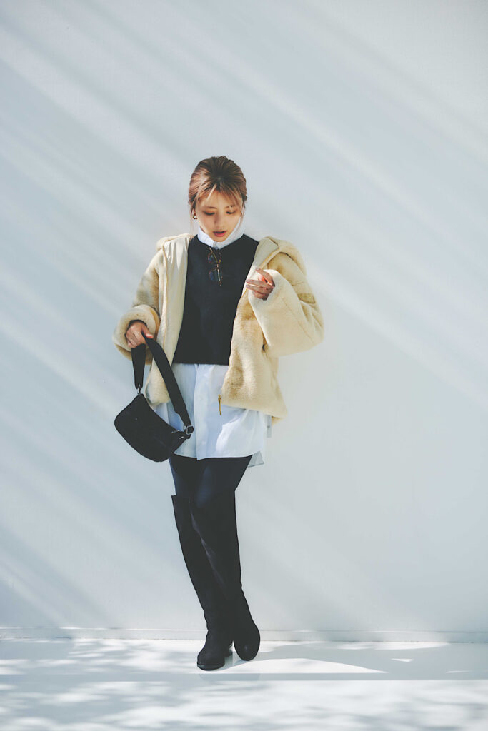 「このコーデ、とくに好きでした! 甘めのファーブルゾンなのに、インナーがモノトーンになっているおかげで、大人っぽく見えたのはとても真似してみたいテクニックです」