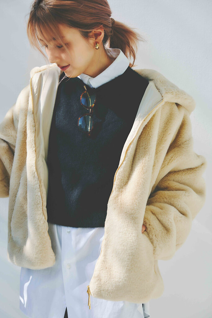 Sサイズさんのファーアウター選びは、長すぎず、短すぎずの丈に気をつけたいところ。ボリューミーなシルエットでもミドル丈のものなら、ボトムスとのバランスを取りやすく、すっきりとした印象で着こなせます。タトラスのフード付きブルゾンは、4サイズから自分に合ったサイズを選べるところがうれしい。
