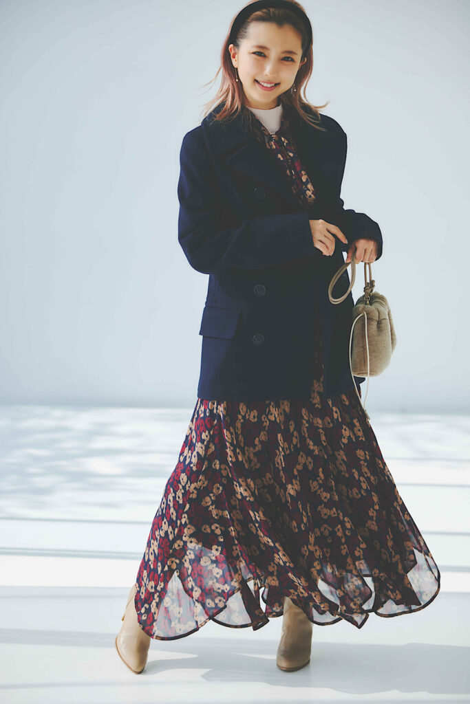 「プライベートでは、パンツに合わせがちだったPコートですが、今回着てみてコーデの幅が広がりました!ぜひワンピースに合わせて、着てみたいなと思います♡」