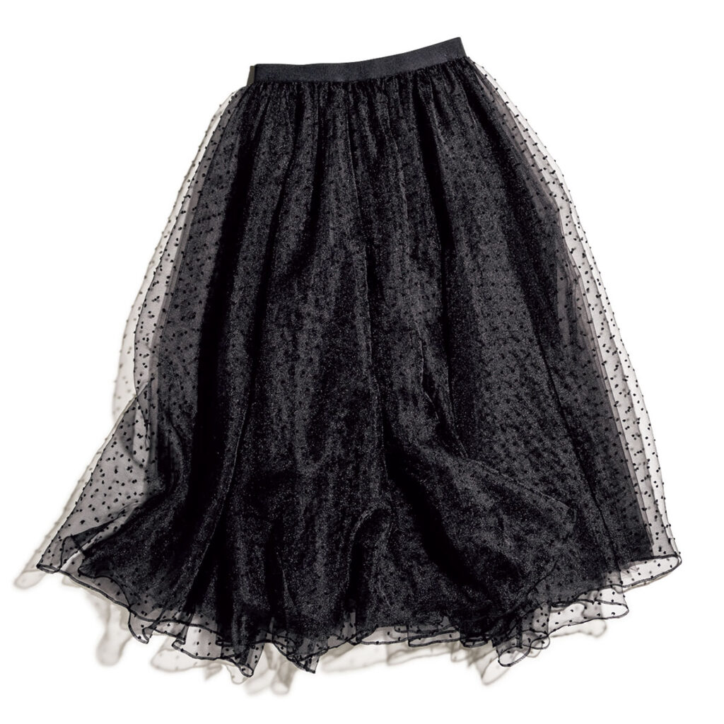 今季注目のイットアイテム、チュールスカート。たっぷりとしたボリュームのものやほっそりとしたスタイルも叶えてくれるシルエットなど、デザインもたくさん。シンプルなトップスや辛口の小物と合わせてクールに楽しみたい。スカート¥35,200(エストネーション)