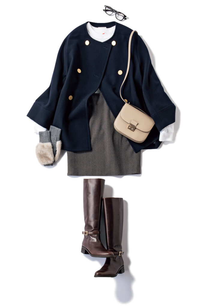 ウールミニスカート着回し ロンT¥2,860(ヘインズ/ヘインズブランズ ジャパン カスタマーセンター)金ボタンコート¥46,200(デミルクス ビームス/デミルクス ビームス 新宿)バッグ¥159,500(ボナベンチュラ)ブーツ¥41,800(ダイアナ/ダイアナ 銀座本店)グローブ¥8,800(ガリャルダガランテ/ガリャルダガランテ 青山店)メガネ¥38,500(アイヴァン/アイヴァン 東京ギャラリー)