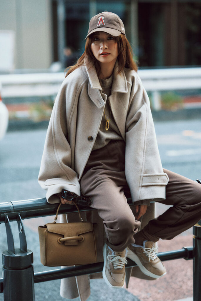 トーンの異なるグレーをつないだコーデ。絶妙な色味のレギンスは、代謝を上げ疲れを軽減する効果も。レギンス¥8,690(スタイルボートマーケット)ニット¥132,000(エイトン/エイトン青山)キャップ¥4,400(ニューエラ)バッグ¥61,600(ヘリュー/ショールーム セッション)ソックス¥3,300(ブルーフォレ/RHC ロンハーマン)スニーカー[JPEXCLUSIVE]¥39,600(デイト/ティースクエア プレスルーム)ピアス¥19,980(アビステ)