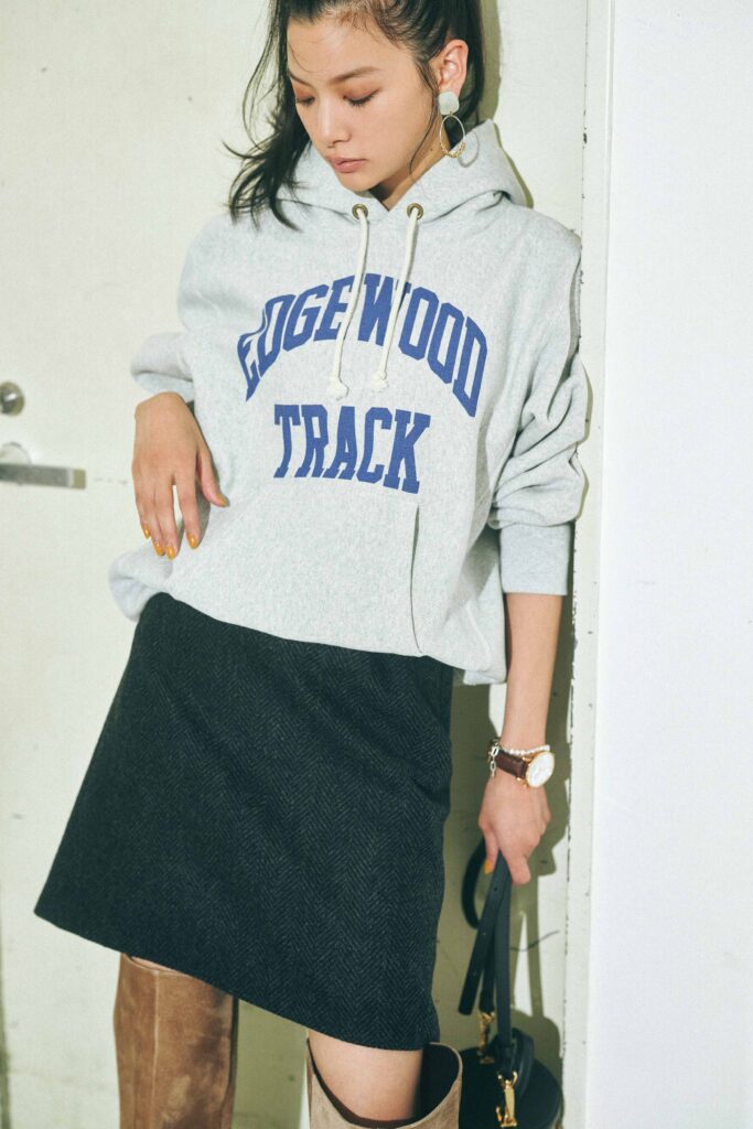 スウェット¥12,980(チャンピオン/ヘインズブランズ ジャパン カスタマーセンター)スカート¥22,000(アンタイトル)バッグ¥25,300(ヴィオラドーロ/ピーチ)ブーツ¥39,600(ダイアナ/ダイアナ 銀座本店)イヤリング¥12,100(マージョリー・ベア/ココシュニック新宿タカシマヤ店)時計¥22,990(クルース/HIROBルミネ新宿店)ブレスレット¥9,350(ココシュニック オンキッチュ/ココシュニック)