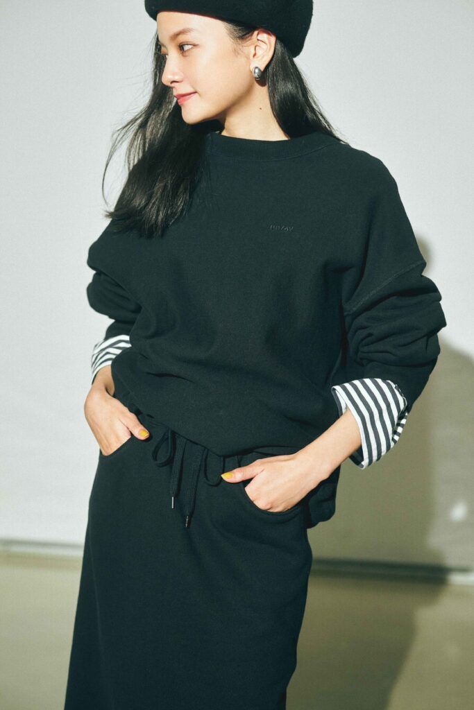ハーフジップのスウェット×ドラマティックに広がる黒スカートのテイストMIXで、誰でもオシャレ上級者な表情に。一見メンズライクなスウェットですが、女性らしさを引き出す着丈やシルエットが、コーデの幅を広げてくれます。ポワンと膨らむボリューム袖は、そのままでもたくし上げても可愛い!