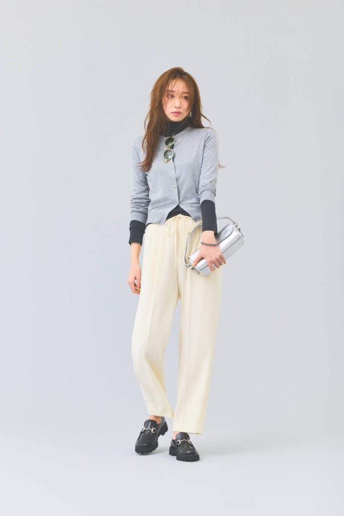 グレーのハイゲージカーデを、ベーシックながら差のつくオシャレへと昇華させる秘訣は、のっぺりとした印象にならないよう、重ねたインナーをあえて覗かせること。手持ちのアイテムで即真似できちゃうコーデをご紹介します。