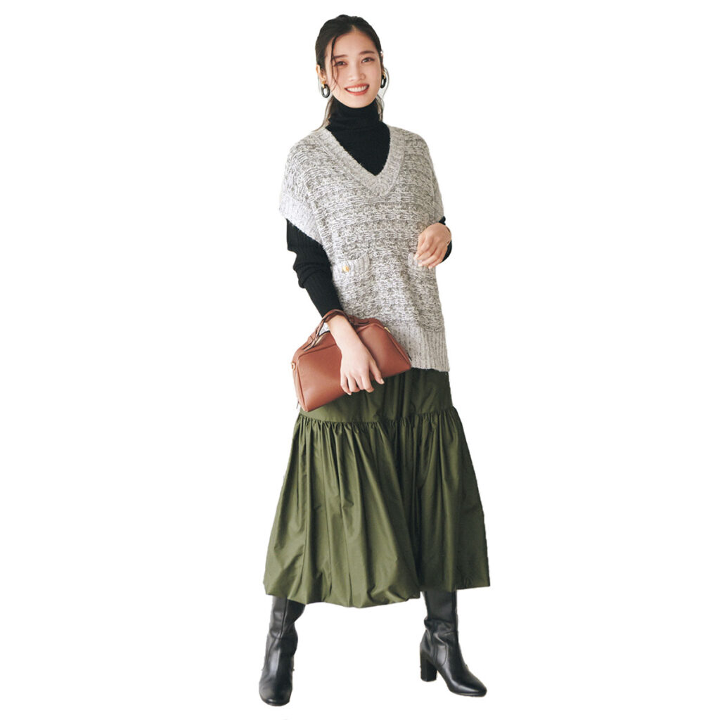 まだまだ寒いこの時季はタートルニットに重ねても。ベスト¥17,600[シャツとセット](エマ テイラー/買えるCLASSY.)タートルニット¥25,300〈ソブ〉スカート¥38,500〈ダブルスタンダードクロージング〉(ともにフィルム)バッグ¥27,500(ロウェル シングス/アバハウスインターナショナル オンラインストア)ブーツ¥39,600(ワシントン/銀座ワシントン銀座本店)イヤリング¥7,020(アビステ)