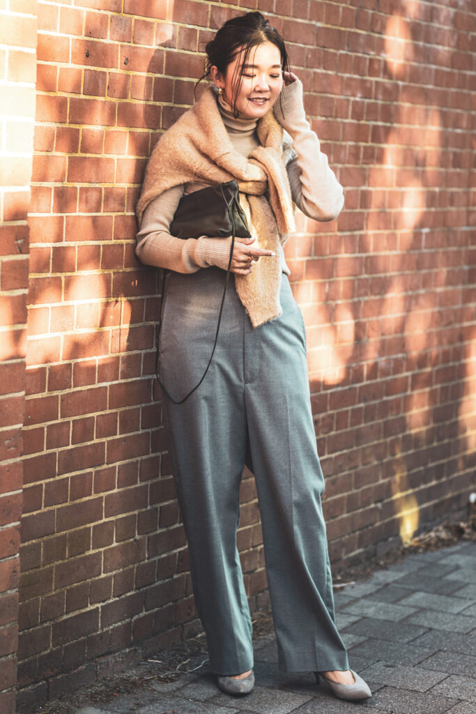 洗練された大人のシンプルコーデで大注目のBEAMSプレス・目黒さん。彼女だからこそ作り出せるグレーとベージュのMIXスタイルを披露してもらいました。