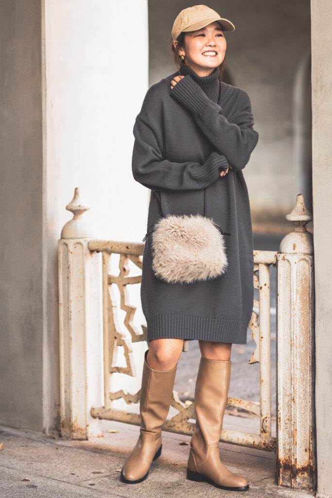 最近はトレンドにあやかってミニ丈を着ることもしばしば。大人でも安心感のある濃グレーですが、重たくならないように、思い切って素肌×ロングブーツで抜けをつくるのが目黒流です。