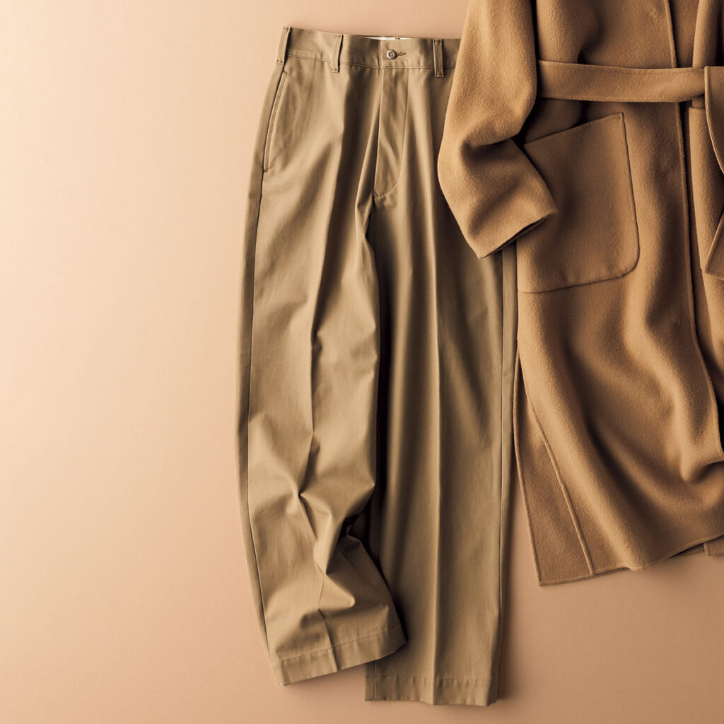澄んだ空気の中を颯爽と歩きたい新年。頼れるのは、底冷えする寒さでも軽快に動ける、チノパンが主役のあったかコーデ。どんなベージュとも好相性の黄味のあるグレージャケットに黒のコートを羽織れば全体がシャープにまとまります。