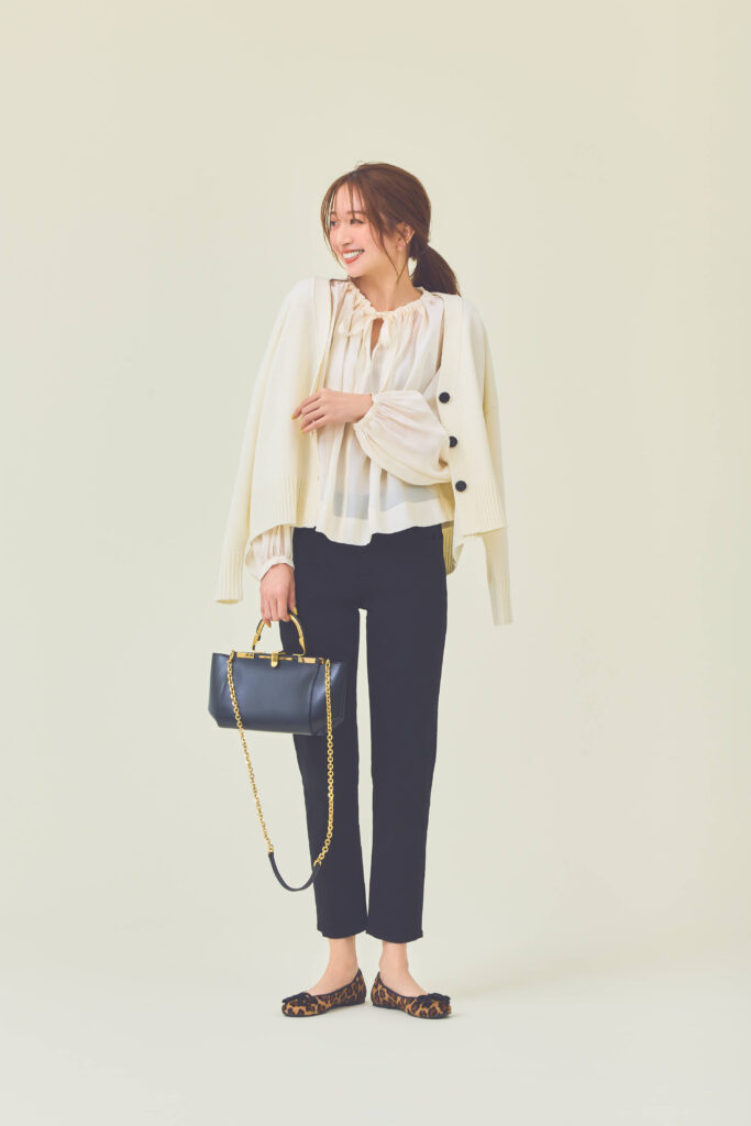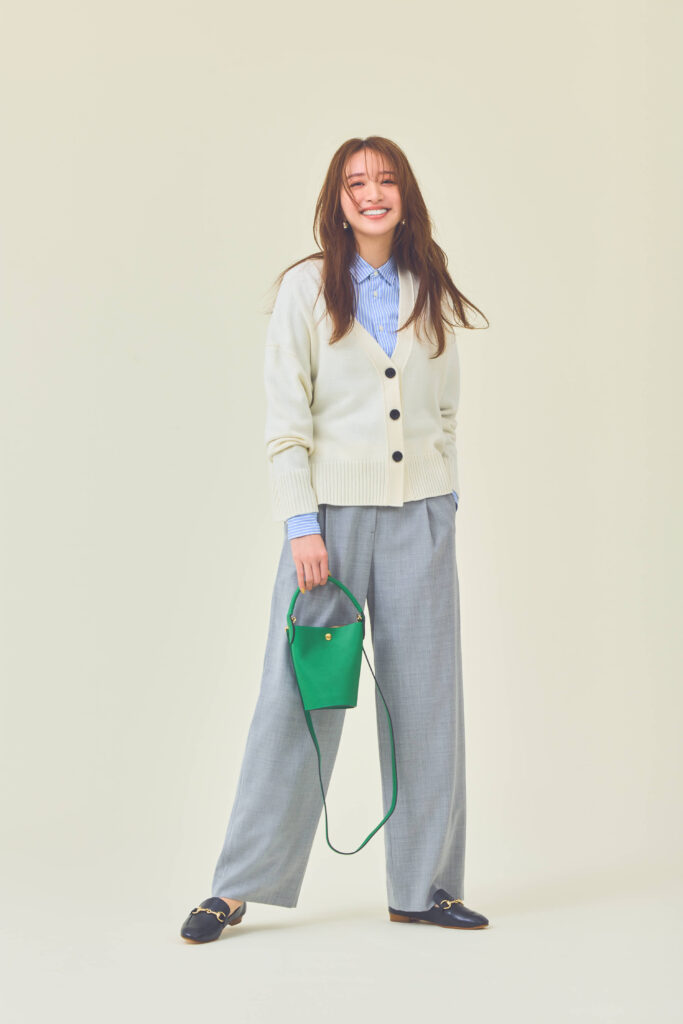 着回し力抜群の白カーデはパンツスタイルでハンサムに