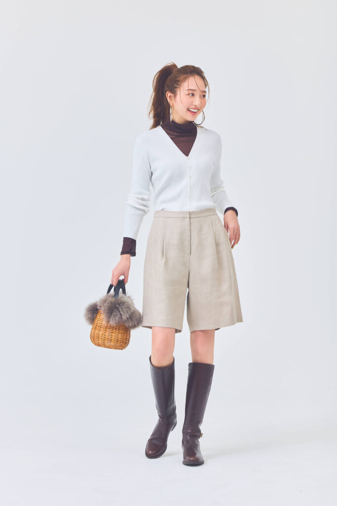 きれいめにまとめるとコンサバすぎる白のハイゲージカーデは、カジュアル要素を効かせたコーデに合わせるのが最適解。ごわつかないよう、インナーは薄手のものを選んで。