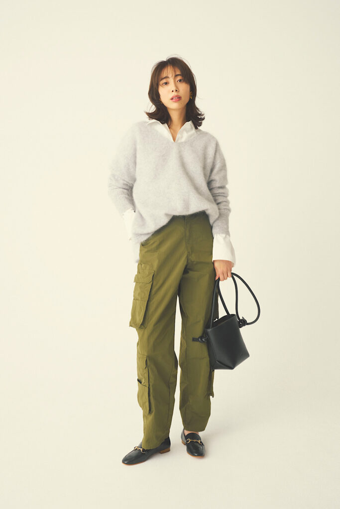 きちんと感のあるチノパンツなら、リブタートルニットとのシンプルな組み合わせが即洗練されます。物足りなさを感じず、着こなしが決まって見える秘訣は、トラッドな小物にあり。かっちりとしたベルトやローファーが全体を引き締めてくれて、大人っぽいムードで着こなせます。ニット¥2,990(UNIQLO)パンツ¥33,000(タンジェント)ベルト¥23,100(カオス/カオス丸の内)バッグ¥20,900(パピルス/アイネックス)シューズ¥8,910(マミアン/マミアン カスタマーサポート)ピアス¥24,090(ソコ/ZUTTOHOLIC)