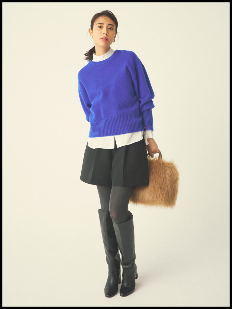 「ベーシックなニットを激変させるなら、襟元、袖口、裾の印象を変えるのがコツ」とスタイリスト・児嶋さん。ここでもレイヤードに適したフリルブラウスを3箇所から覗かせて、洒落感たっぷりに着こなします。やや丈長めのショートパンツとロングブーツの組み合わせもトレンド感ばっちり。ニット¥17,930(アルページュストーリー)ブラウス¥19,800(アンヌ/バード)パンツ¥17,930(ネイヴ/オンワード樫山)バッグ¥16,500(ダイアナ/ダイアナ 銀座本店)ブーツ¥71,500(ファビオ ルスコーニ/ファビオ ルスコーニ ルミネ有楽町店)イヤリング¥2,090(アネモネ/サンポークリエイト)