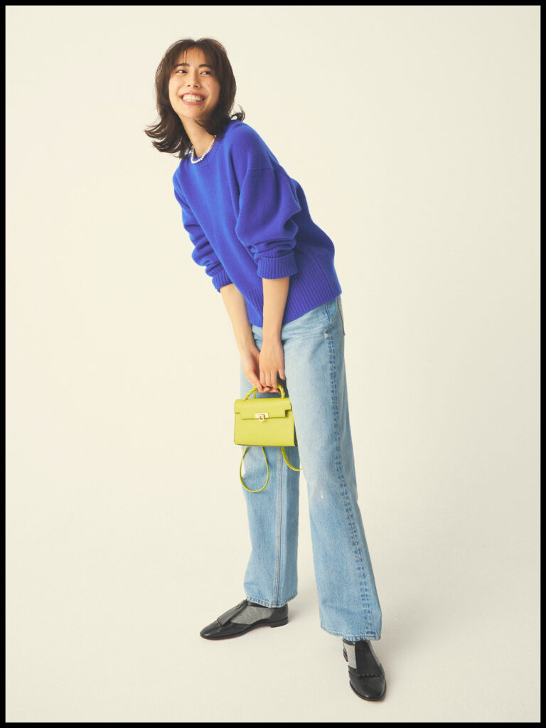 配色に悩みがちなカラーニットは、濃淡の違うアイテムを合わせて、ワントーンでまとめるのが簡単。濃いめのブルーニットなら薄色のデニムを。差し色にライムグリーンを投入すれば、着こなしがワンランクアップします。仕上げにパールネックレスで女性らしさを添えつつ、ソックスを覗かせた足元で抜け感を演出。ニット¥18,700(アルページュストーリー)パンツ¥9,680(Mila Owen)バッグ¥6,490(カシュカシュ/アンビリオン)ソックス¥1,320(タビオ/Tabio)シューズ¥24,200(銀座かねまつ/銀座かねまつ6丁目本店)ネックレス¥14,850(エイチアッシュ/フォーティーン ショールーム)