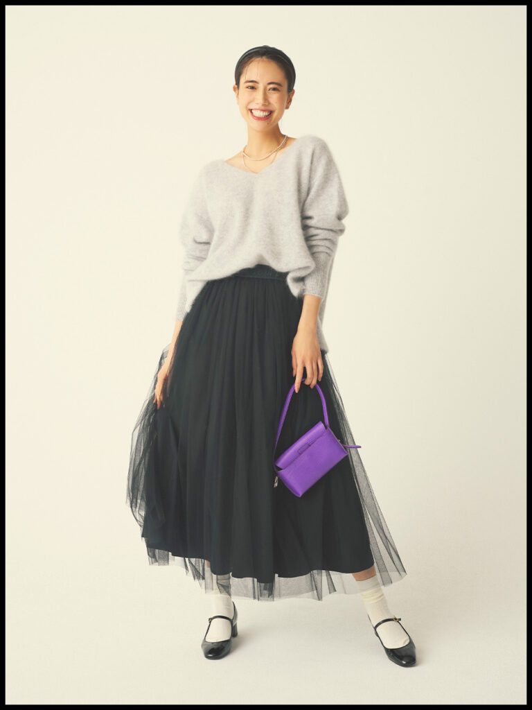 今季注目のチュールスカートは、透け感がありながらも動きが出るため、シンプルなワンツーコーデをブラッシュアップしてくれます。軽やかな素材の組み合わせなら、モノトーン配色でも女っぽい印象に。カチューシャやメリージェーンで、フレンチシックに仕上げます。ニット¥49,500(カオス/カオス丸の内)スカート¥30,900(マイカ アンド ディール/マイカ アンド ディール 恵比寿店)バッグ¥19,800(トフ&ロードストーン/T&L)パンプス¥38,500(ファビオ ルスコーニ ペル ワシントン/銀座ワシントン銀座本店)靴下¥1,540(タビオ/Tabio)カチューシャ¥1,320(アネモネ/サンポークリエイト)ボールネックレス¥39,380(アルポ/ZUTTOHOLIC)チェーンネックレス¥9,350(イン ムード/フォーティーン ショールーム)