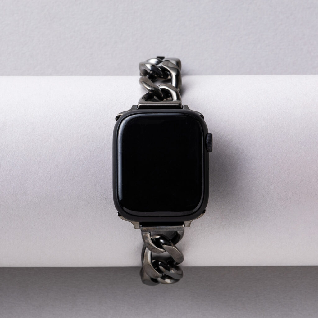 黒に近いシルバーチェーンが、キレイめな着こなしのスパイスに。ほかのアクセサリーとのコンビネーションを楽しめます。簡単にコマを取り外せて、チェーンの長さを自分仕様に調節可能。ストラップ¥11,660(CASETiFY)