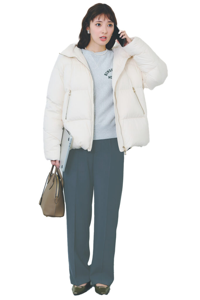 スウェット着回し ニットスカート¥28,600(マルティニーク/マルティニーク ルミネ横浜)ダウン¥115,500(タトラス/タトラス コンセプトストア 青山店)キャップ¥4,400(ニューエラ)リュック¥34,650(レスポートサック/レスポートサック ジャパン)エコバッグ¥3,300(ピルグリムサーフ+サプライ)イヤリング¥6,820(イットアトリエ/フォーティーン ショールーム)