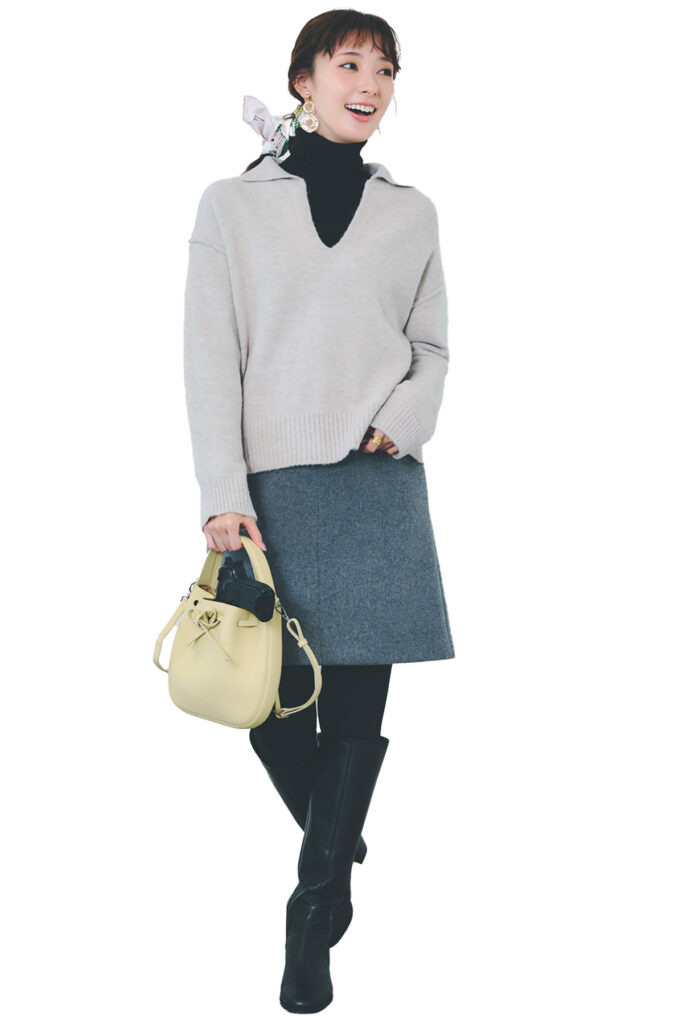 ウールミニスカート着回し カットソー¥13,200(セント ジェームス/セント ジェームス代官山店)ニット¥2,490(GU)タイツ¥1,650(靴下屋/タビオ)バッグ¥24,200(ヴィオラドーロ/ピーチ)ブーツ¥3,990(GU)イヤリング¥3,570(アビステ) リング¥14,300(イン ムード/フォーティーン ショールーム)