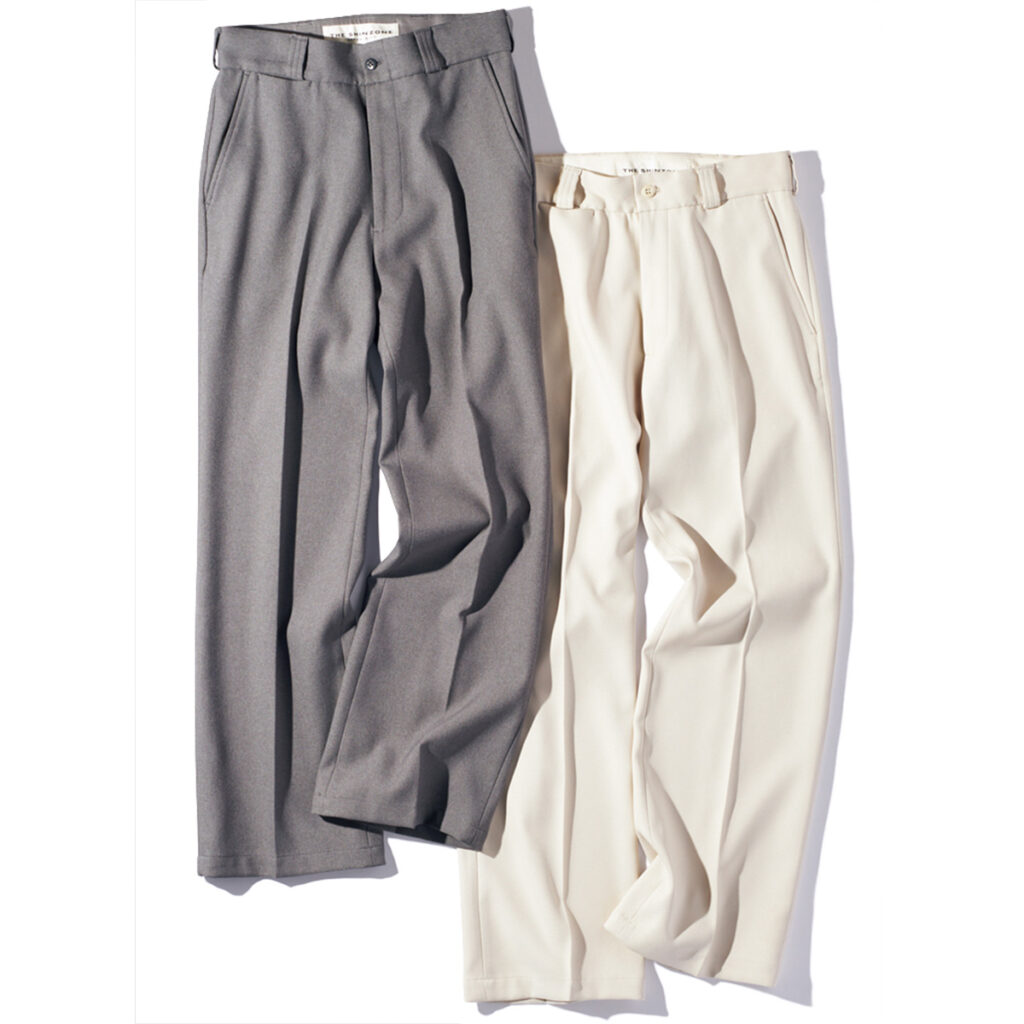 シンゾーンのアイコンアイテムとも言えるセンタープレスパンツ。ホワイト・グレー・ブラックと、ベーシックで使いやすいカラバリに加え、プチからトールまで計6サイズ展開なので、自分に合ったサイズを見つけられます。イージーケアのポリエステル素材だからシワになりにくいのも◎。パンツ各¥23,100(ともにザ シンゾーン/シンゾーン 表参道本店)