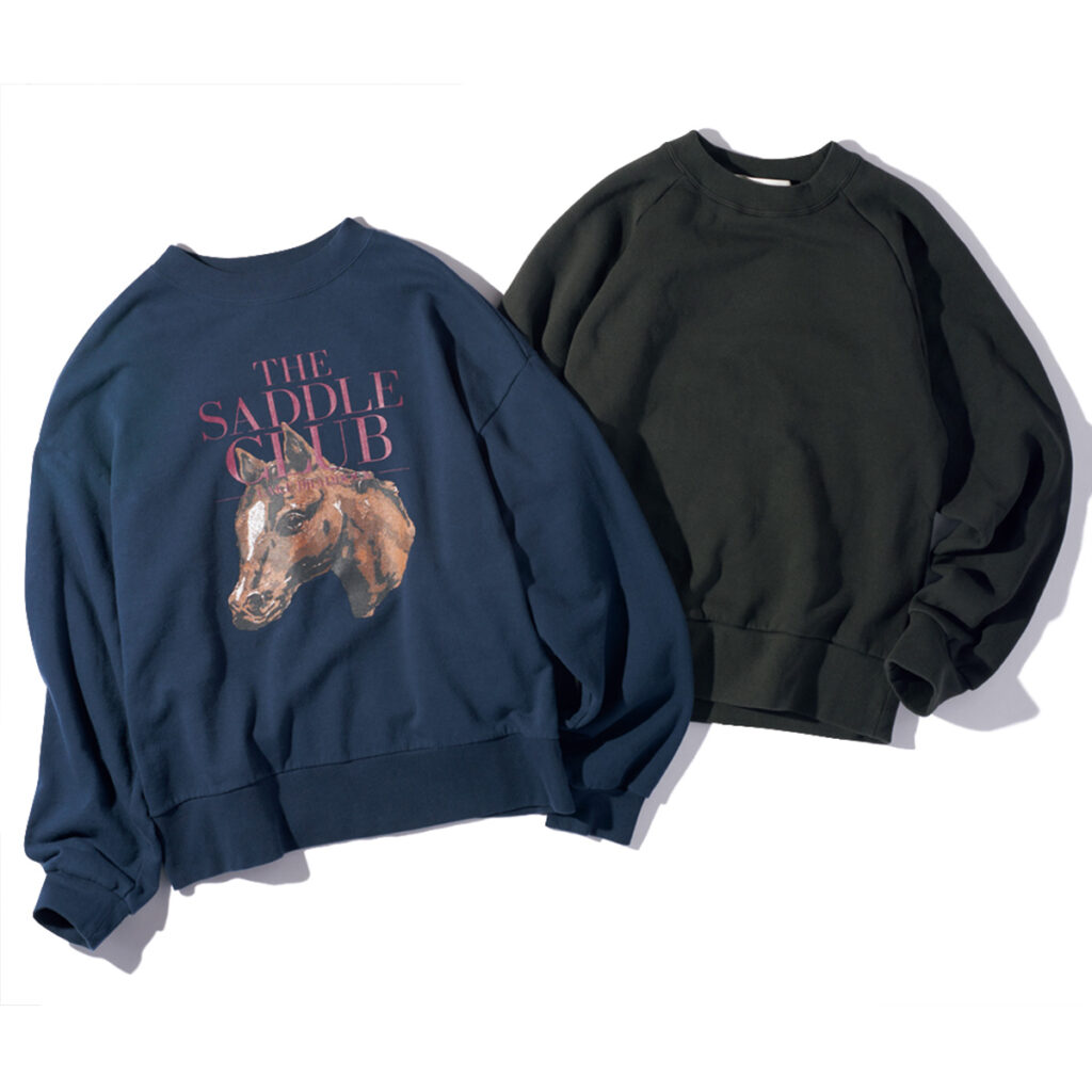 古着のようなこなれた風合いが魅力。着膨れ感が出ない薄手の生地は3シーズン着回せるほか、裾をインしたスタイルも可能。体が絶妙に泳ぐサイジングで、着るだけでこなれたシルエットを作ります。右から/無地スウェット¥15,400ホースプリントスウェット¥18,700(ともにザ シンゾーン/シンゾーン 表参道本店)