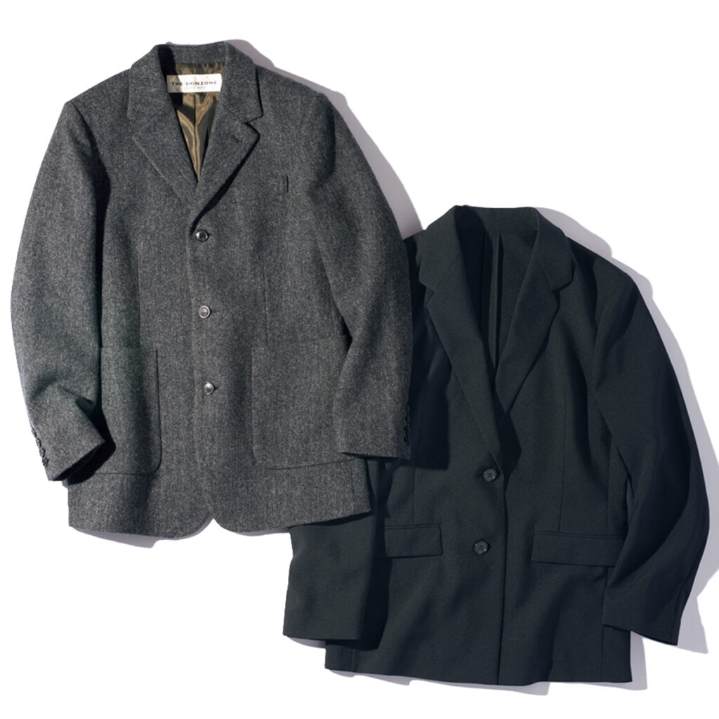 右/シーンを選ばない無地ジャケットはシャツ感覚でさらっと羽織れる一重仕立て。黒ジャケット¥39,600 左/ヘリンボーンツイードジャケットは、ベージュとグレーの2色で展開。英国羊毛がブレンドされていて型崩れしにくい仕立てはさすが。ヘリンボーンジャケット¥53,900(ともにザ シンゾーン/シンゾーン 表参道本店)