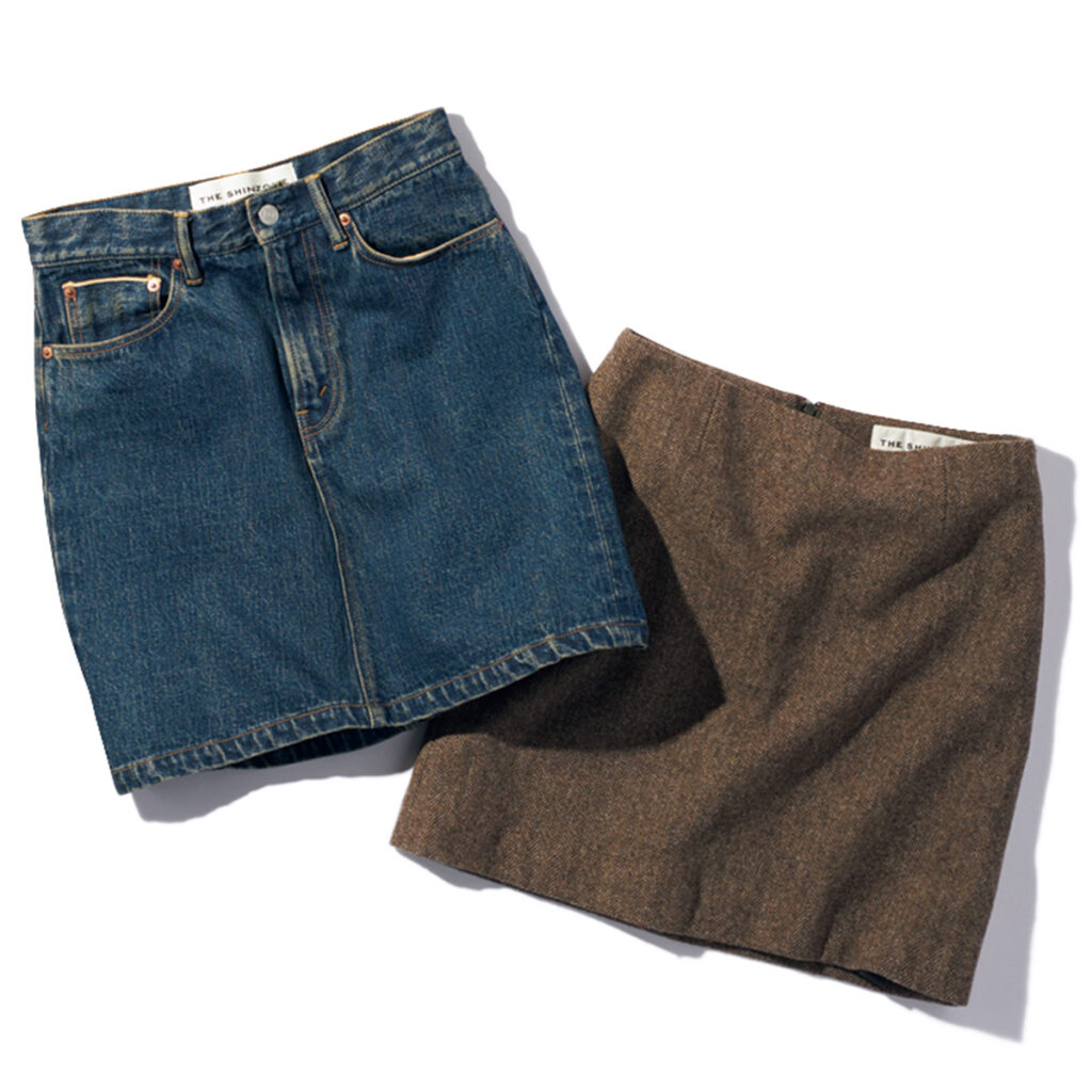 右/温かみのあるヘリンボーンツイードは、リブやグレータイツとも相性抜群。ヘリンボーンスカート¥25,300 左/シンゾーンの定番Gジャンと同じデニム生地を使用。独特な色落ちにファンが多い、経年変化を楽しめるシリーズ。デニムスカート¥20,900(ともにザ シンゾーン/シンゾーン 表参道本店)