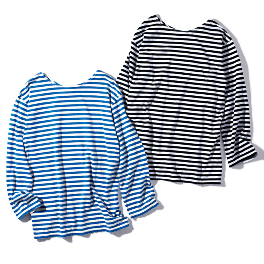体が泳ぐゆったりとしたサイジング、鎖骨が覗く衿元、ゆるやかに落ちたドロップショルダーなど、着痩せディテールが盛りだくさん。ほどよい薄手素材なので1枚ではもちろん、レイヤードしてもサマになります。ボーダーカットソー各¥10,780(ともにザ シンゾーン/シンゾーン 表参道本店)