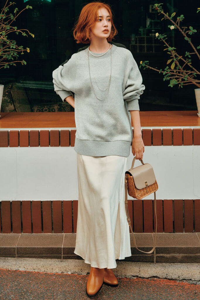 光沢のあるサテンスカートを取り入れて、スウェットとの異素材感を楽しみたい。スウェット¥15,400(ザ シンゾーン/シンゾーン 表参道本店)スカート¥26,400(カデュネ)バッグ¥20,900(ヴィオラドーロ/ピーチ)ブーツ¥41,800(ダイアナ/ダイアナ 銀座本店)パールネックレス¥17,710(メルセデス・サラザール/ZUTTOHOLIC)ボールネックレス¥35,200チェーンネックレス¥60,500(すべてマリハ)