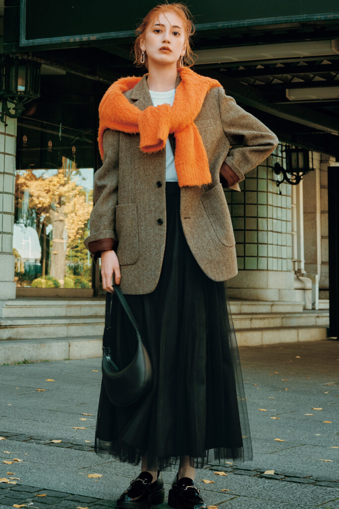 無地ジャケット派のマンネリ打破にはヘリンボーンツイードを。無地感覚で取り入れられる端正なシングルジャケットが、冒険アイテムのチュールスカートを受け止めて大人の上品コーデへと変換。ジャケット¥53,900(ザ シンゾーン/シンゾーン 表参道本店)Tシャツ¥1,500(UNIQLO)カーディガン¥72,600(ブリル/ブリル新宿)スカート¥30,900(マイカ アンド ディール/マイカ アンド ディール 恵比寿店)バッグ¥61,600(ロンシャン/ロンシャン・ジャパン)シューズ¥46,200(ファビオ ルスコーニ/ファビオ ルスコーニルミネ有楽町店)ピアス¥24,090(ソコ/ZUTTOHOLIC)ブレスレット¥6,600(エイチアッシュ/フォーティーン ショールーム)