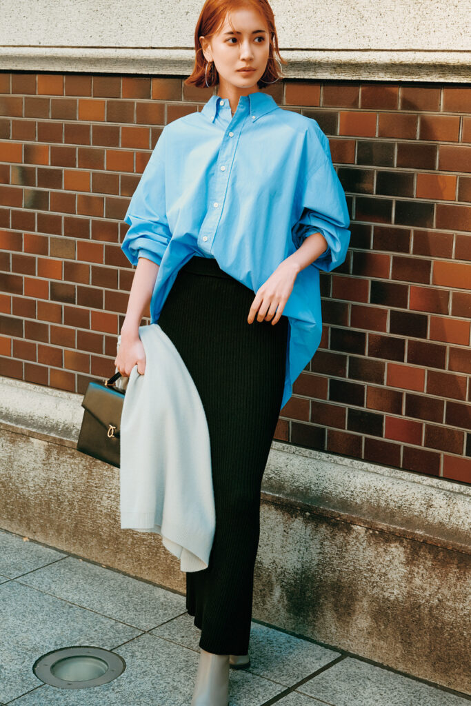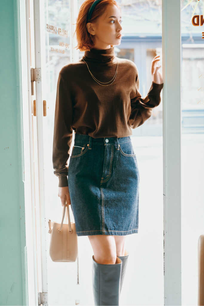 子供っぽくなりがちなデニムミニは「ハイウエスト」「短すぎない」「すっきりとした台形」を選べば大人仕様に。ミニマムなコ ーディネートでも新鮮な仕上がり。スカート¥20,900(ザ シンゾーン/シンゾーン 表参道本店)ニット¥31,900(スローン/ザ ショップ スローン 新静岡セノバ店)バッグ¥42,900(VASIC/ヴァジックジャパン)ブーツ¥71,500(ファビオ ルスコーニ/ファビオ ルスコーニ ルミネ有楽町店)ネックレス¥51,700(アナプノエ/フォーティーン ショールーム)バングル¥18,260(ソコ/ZUTTOHOLIC)カチューシャ¥1,320(アネモネ/サン ポークリエイト)