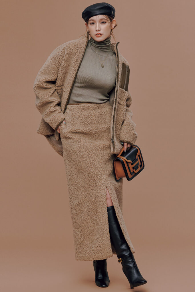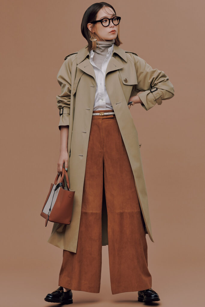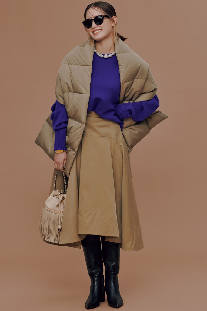大野:モノトーンはもちろん、紺でも茶でも、きれい色ならビビッドでもパステルでも。とにかく万能なの。ちなみに私、ベージュはあまり着ない…。(荒木)さっちゃんはよく全身ベージュとか着るじゃない?すごいなって思う。