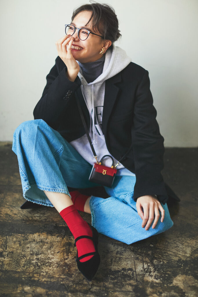 メリージェーンパンプスに赤ソックスをきかせてパリっぽく。ソックス¥1,100(Tabio/タビオ)パンプス¥38,500(プリティ・バレリーナ/F.E.N.)カシミヤジャケット¥154,000(styling//styling/ルミネ新宿1店)フーディ¥13,200(エミ/エミ ニュウマン新宿店)タートルニット¥42,900(コズ マニュファク チャード バイ ラッピンノット/ウメダニット)デニムパンツ¥27,500(アッパーハイツ/ゲストリスト)ミニバッグ¥220,000(ロウナー ロンドン/エイチ アイ ティー)メガネ¥41,250(オリバーピープルズ/ルックスオティカジャパン カスタマーサービス)イヤリング¥5,250(アビステ)