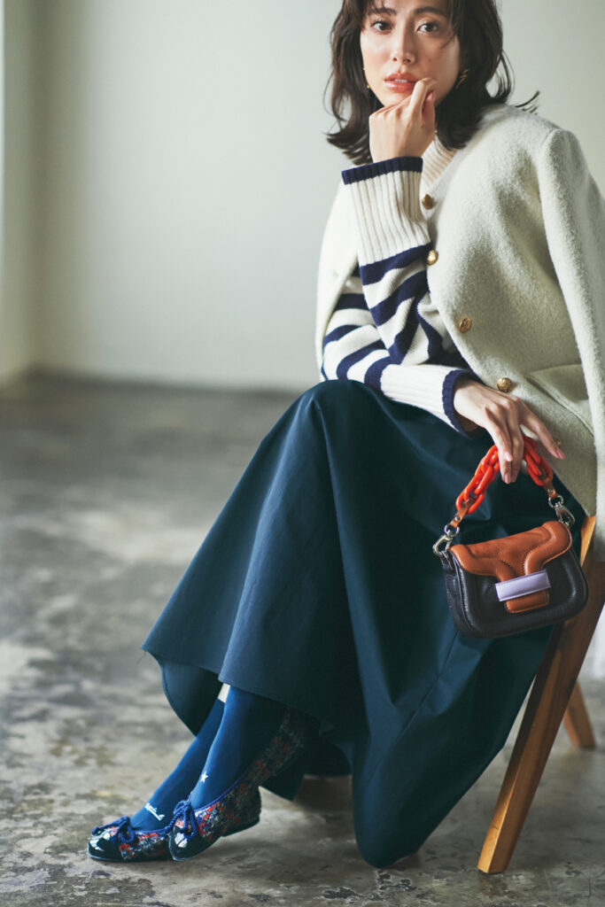 ミックスツイードのバレエシューズから、一色取ったネイビーのソックスでまとまり感のある足元に。甲のワンポイントデザインがキレイめな着こなしに遊び心を添えてくれます。ソックス¥1,760(アニエス ベー/福助)バレエシューズ¥33,000(プリティ・バレリーナ/F.E.N.)ジャケット¥52,800(ハウント/ ハウント代官山/ゲストリスト)ボーダーニット¥18,920(アルページュストーリー/アルページュストーリー プレスルーム)スカート¥17,600(HeRIN.CYE/バロックジャパン リミテッド)バッグ¥143,000(ピエール アルディ/ピエール アルディ 東京)ピアス¥25,080(エムシー・スタジオ/ZUTTOHOLIC)