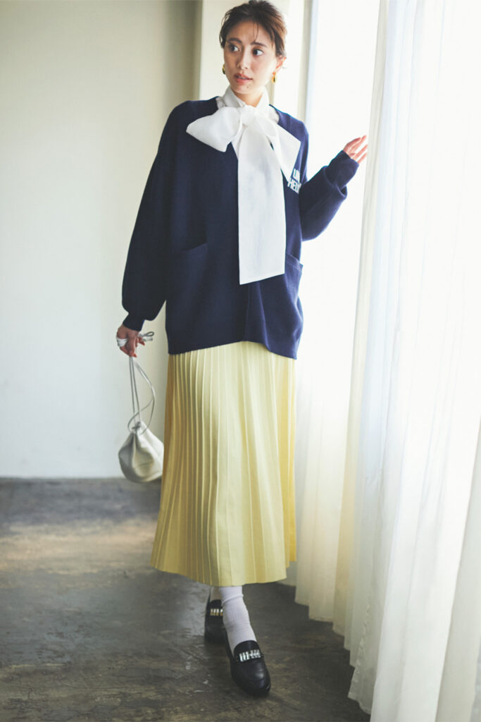 クラシカルなローファーときちんと感のある白ソックスは相性抜群!エレガントなプリーツスカートに表面がつるんとした白ソックスだと甘くなりすぎてしまうので、リブ入りタイプを選んでカジュアルダウンを。ソックス¥1,320(Tabio/タビオ)ローファー¥39,600(カステラーノ/アルアバイル)カーディガン¥16,500(ルージュ・ヴィフ アンナ/ルージュ・ヴィフ ラクレ ルミネ新宿店)ブラウス¥35,200〈ソブ〉巾着バッグ¥19,800〈ダブルスタンダードクロージング〉(ともにフィルム)スカート¥15,000(COS/COS 青山店)ピアス¥25,300(エムシー・スタジオ/ZUTTOHOLIC)