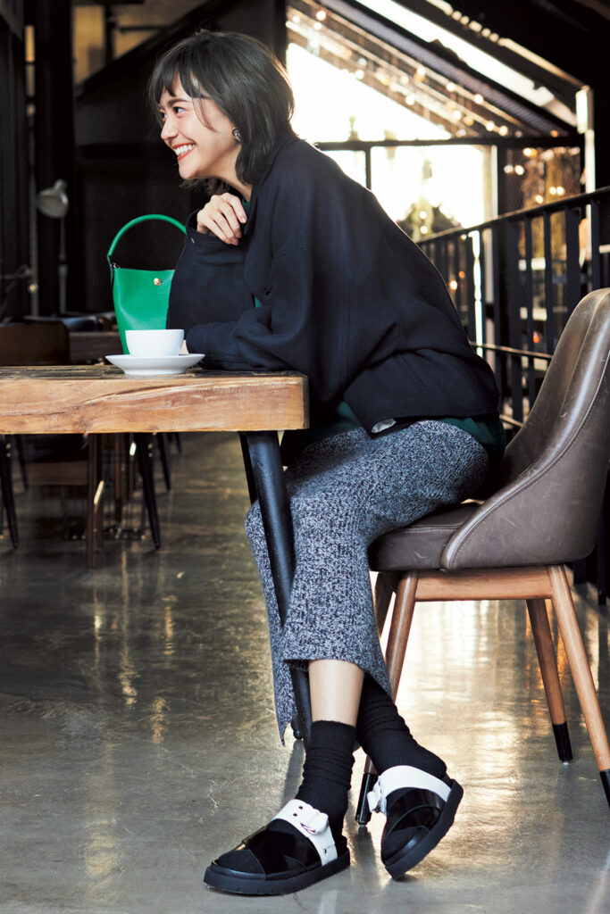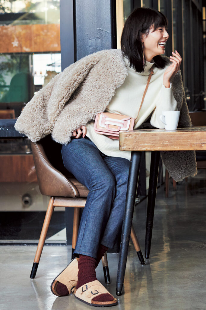 ヌーディなベージュサンダルにバーガンディのふかふかソックスでぬくもり感を。ソールに厚みのあるソックスならつま先や足裏も抜かりなく暖か。リブソックス¥1,760(靴下屋/タビオ)サンダル¥19,800(ビルケンシュトック/ビルケンシュトック・ジャパン カスタマーサービス)ジャケット¥12,980(アンフィーロ)ニット¥18,700(ジャスグリッティー/ジャスグリッティー プレスルーム)デニムパンツ¥23,100(アッパーハイツ/ゲスト リスト)バッグ¥124,300(ピエール アルディ/ピエール アルディ 東京)ピアス¥30,800(リューク)