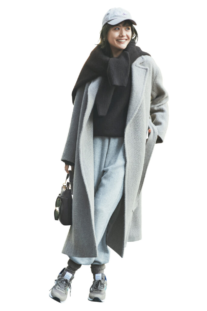 ベージュリブソックス¥1,210(靴下屋/タビオ)スニーカー¥11,990(ニューバランス/ニューバランス ジャパンお客様相談室)コート¥220,000(ベイジ,/オンワード樫山 お客様相談室)ニット¥46,200肩に掛けたニットカーディガン¥61,600(ともにスローン/ザ ショップ スローン 新静岡セノバ店)スウェットパンツ¥16,500(ザ シンゾーン/シンゾーン ルミネ新宿店)バッグ¥38,500(スタジオアタオ)キャップ¥5,500(アッパーハイツ/ゲストリスト)サングラス¥25,630(レイバン/ルックスオティカジャパン カスタマーサービス)イヤリング¥6,090(アビステ)