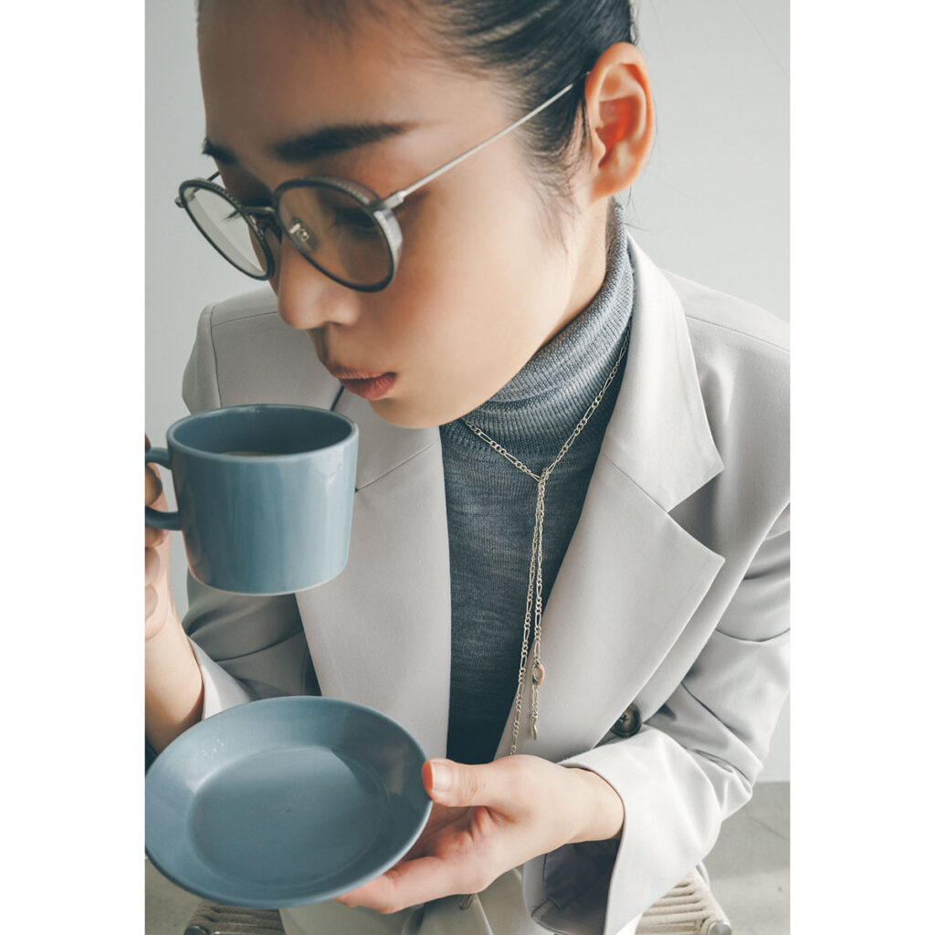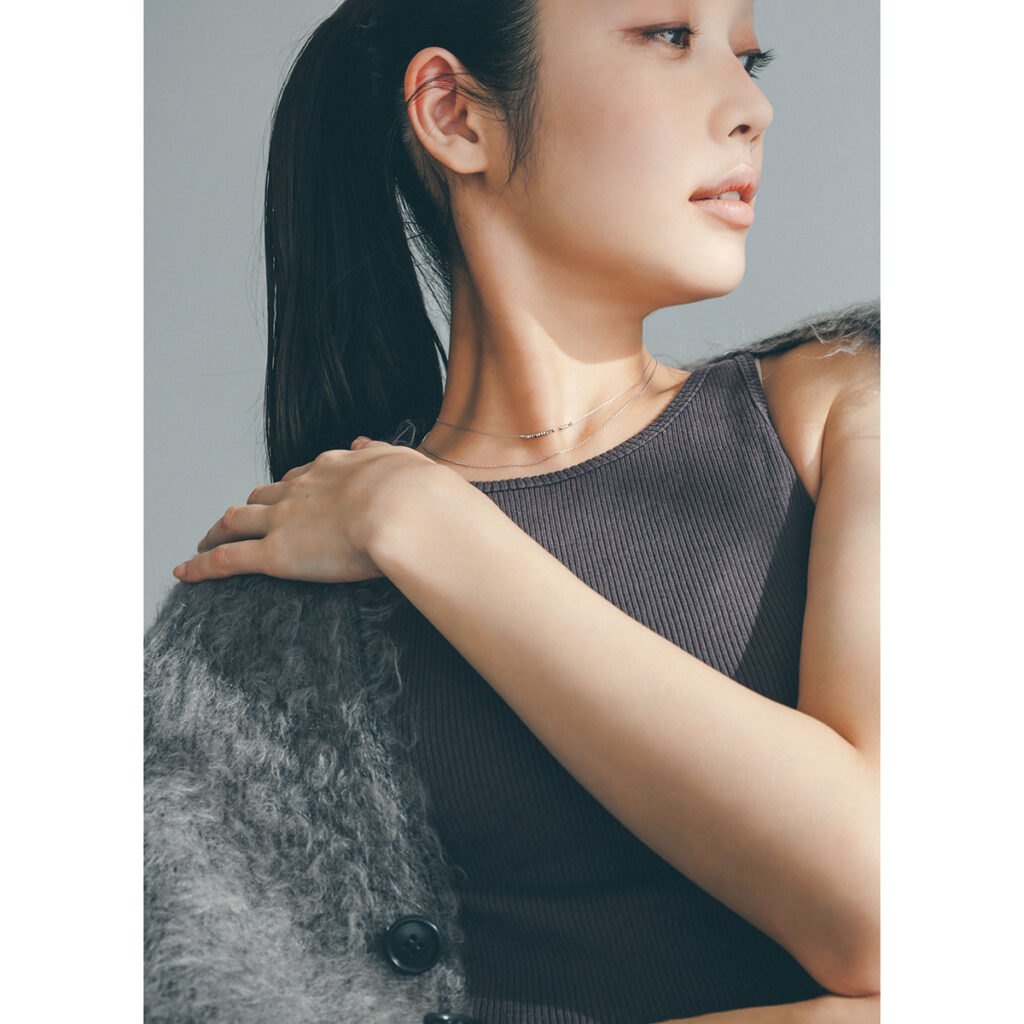 グレートーンに調和するホワイトゴールド。肌を見せる日は線の細いものだけに絞ると、品はいいのに顔映りよし。肌も素材感のひとつとして捉えると装いの完成度が高まりそう。レス・イズ・モア、引き算の美学。ネックレス〈WG〉・上¥62,700 下¥70,400(ともにマリハ)カーディガン¥46,200(スローン/ザ ショップ スローン新静岡セノバ店)タンクトップ¥14,300(マイ ウィークネス)