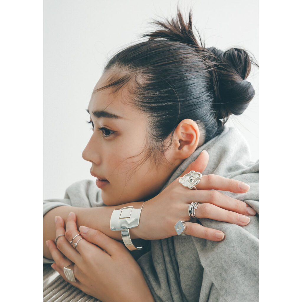 太さに緩急をつけるのがコツ。右手・薬指リング〈YG〉上¥159,500〜下¥192,500〜(ともにジャスティン デイビス/JACK of ALL TRADES press room)右手・人差し指¥39,600左手・人差し指リング¥50,600トリプルフィンガーリング¥63,800(すべてコールムーン/ショールーム セッション)左手・中指上〈YG×D〉¥53,900(アナプノエ/フォーティーン ショールーム)フード付きニット¥53,900(アンタイ トル カプセル コレクション/アンタイトル)タートルニット¥27,500(スローン/ザ ショップ スローン 新静岡セノバ店)