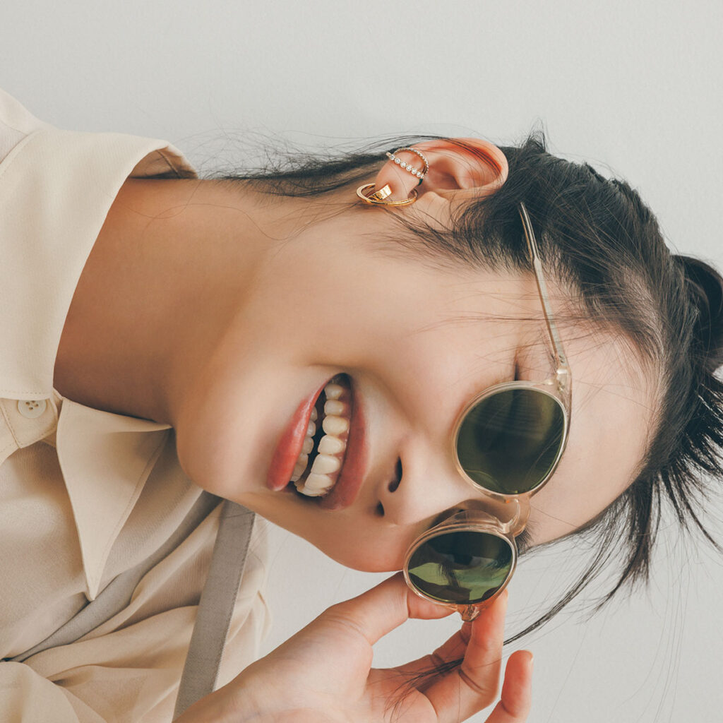 洒落たアシンメトリーな耳もと。イヤーカフ・上から〈YG×D×マラカイト〉¥97,900〈YG×D〉¥101,200〈YG×D〉¥93500(すべてプライマル)イヤリング¥42,900(モニス/フォーティーン ショールーム)サングラス¥36,740(オリバーピープルズ/ルックスオティカジャパン カスタマーサービス)シャツ¥41,800オールインワン¥57,200(ともにソブ/フィルム)