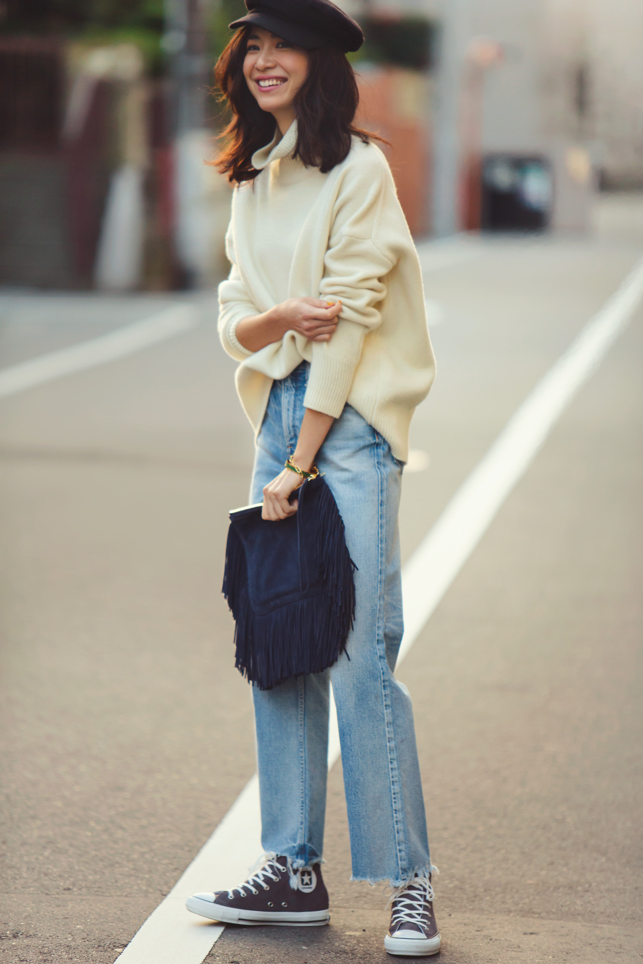 ニット¥34,000(エーピー ストゥディオ/エーピー ストゥディオ ニュウマン シンジュク)デニムパンツ¥25,000(アッパーハイツ/ゲストリスト)キャスケット¥7,000(CA4LA/CA4LA ショールーム)クラッチバッグ¥47,000(ピエール アルディ/ピエール アルディ 東京)スニーカー¥18,000(CONVERSE×STUNNING LURE/スタニングルアー 青山店)バングル¥11,000(アロン/フラッパーズ)ブレスレット¥46,500(チーゴ/ミックステープ)
