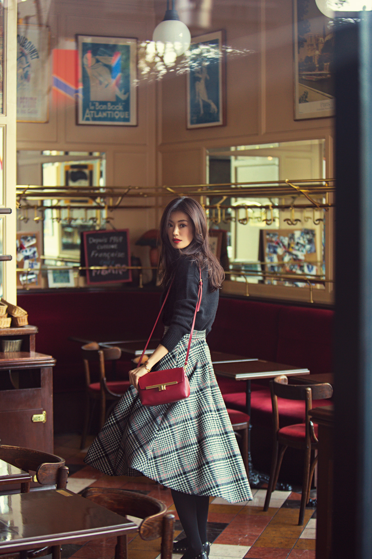 上半身が華奢で、下半身にボリュームのあるウェーブタイプは、タイトなトップスにフレアスカートで女のコらしさを加速させて。