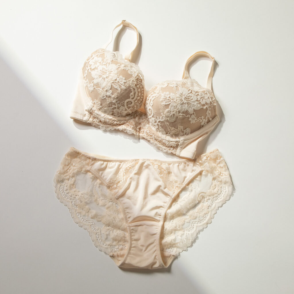 締めつけ感のない快適さを求める一方で、バストの形崩れを防げる補整下着が気になるという人も。補整下着専門ブランドの「MARUKO」には年齢や体型のお悩みに寄り添ったラインナップが充実。3Dサーキュラーワイヤーがバストラインをキレイに整えつつ、サイドはすっきりシェイプ。肩の傾斜に沿ったストラップでズレも軽減します。肌あたり柔らかな総レースショーツには程よいパワー感があり、ヒップをサポート。日常的にボディメイクランジェリーを身につけることで、気づかぬうちに美意識までも高まりそう。