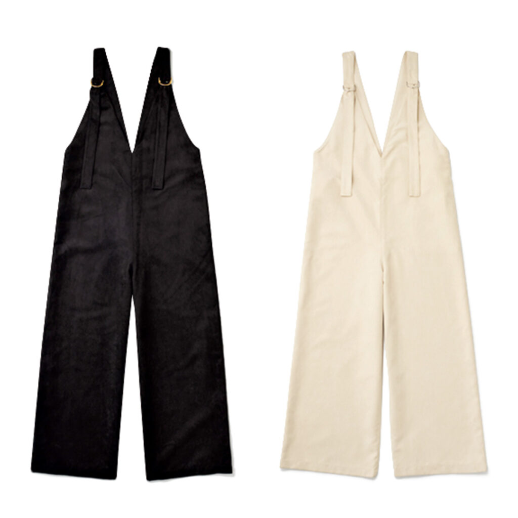 『毎回試作を重ねて理想の形に仕上げているコラボサロペット。今回はより大人っぽく着られるように、深Vデザインに。手持ちのトップスに重ねるだけで着こなしの完成度がアップします。』