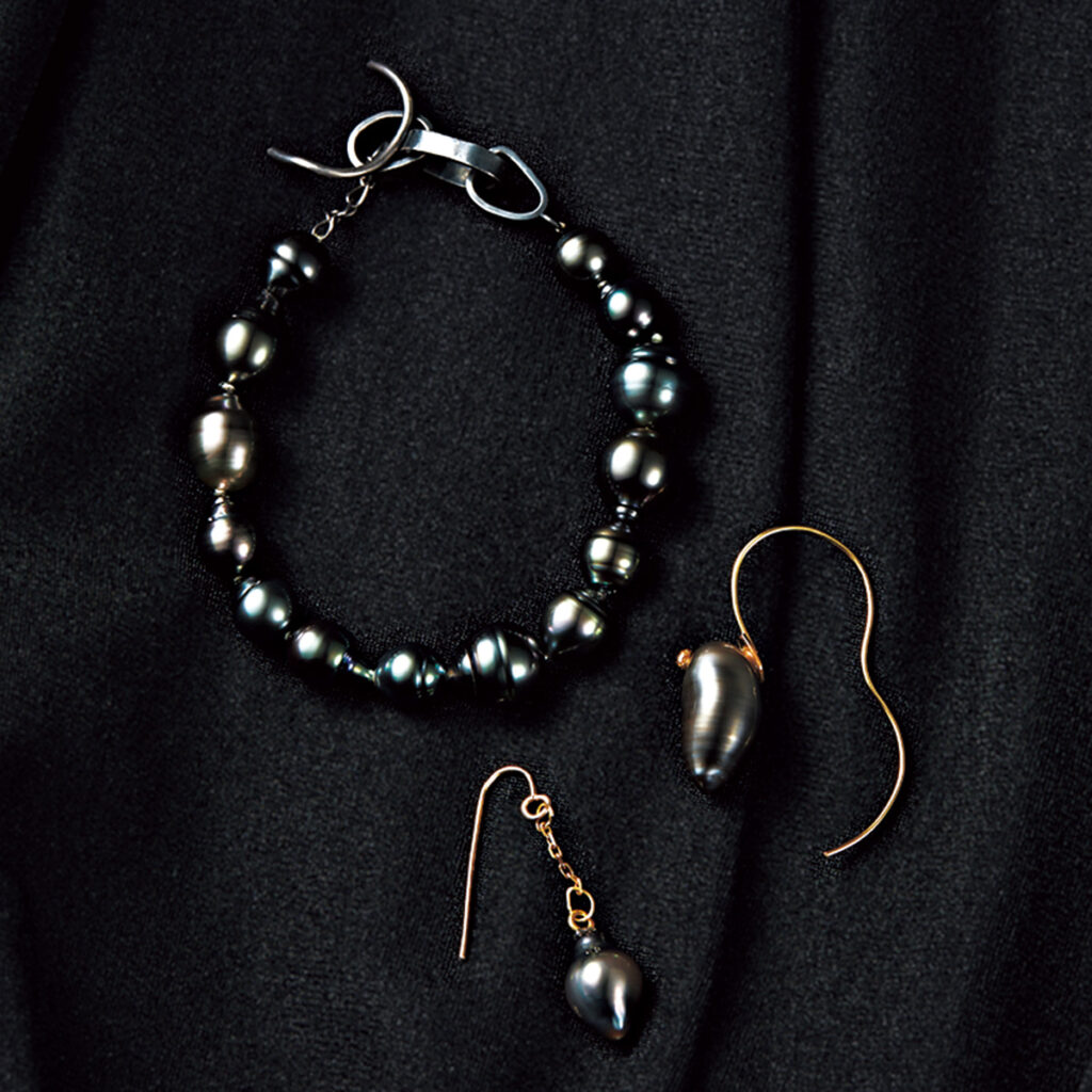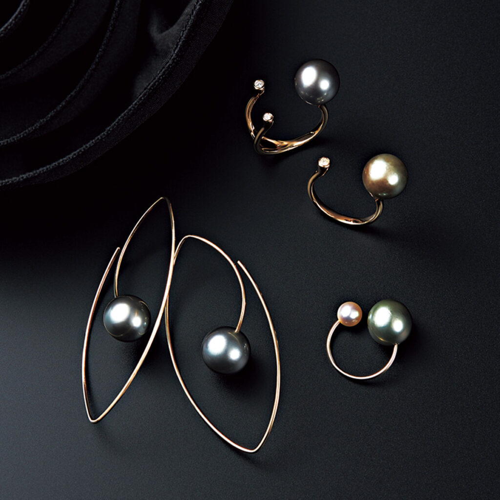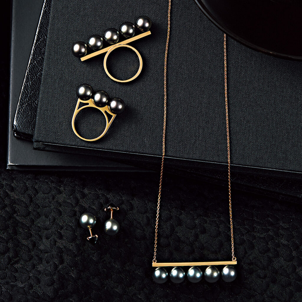 「バランス シグネチャー ブラック ネックレス」〈YG×南洋真珠 黒蝶〉¥837,100「バランス シグネチャー ブラック リング」〈YG×南洋真珠 黒蝶〉¥662,200「バランス エラ ブラック リング」〈YG×南洋真珠 黒蝶〉¥456,500「リファインド リベリオン ブラックスピネル イヤリング」〈YG×南洋真珠 黒蝶×ブラックスピネル〉¥326,700※すべて予定価格(すべてTASAKI)