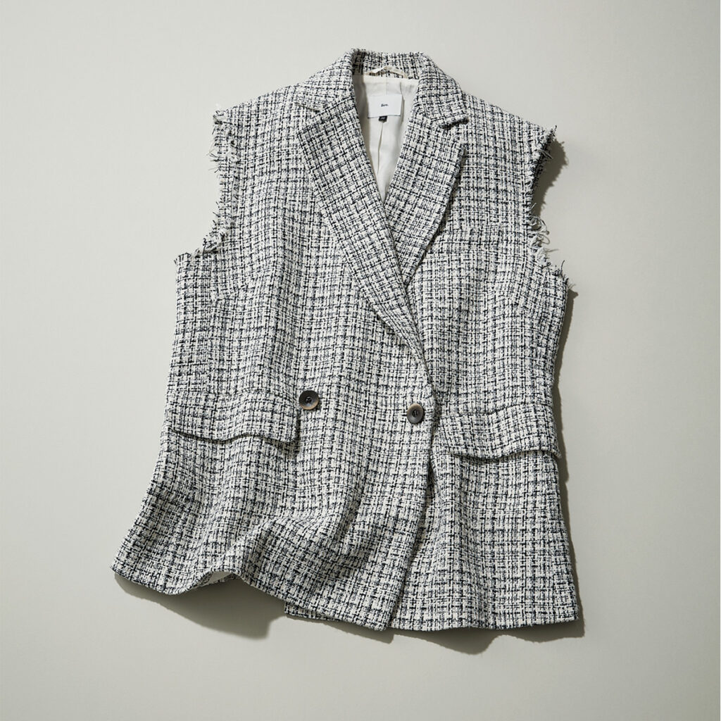 この春のトレンドであるツイード。ジャケットよりもジレの方が軽やかに着られておすすめです。主役級アイテムだからこそ、印象を変えるシーン別の着こなし術を意識して。