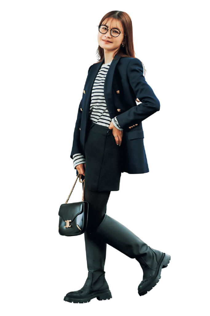 大定番の×ジャケットスタイルは色味を抑えたシックな着こなしに