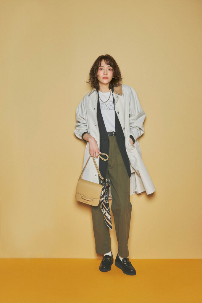 【アイボリー】ナイロン素材のアウターなら重ねても軽やか。日本の気候に合うように作られたナイロン素材のコートは、ユニセックスで着用でき、ボタンで留めるとスタンドカラーに。コート¥51,700(バブアー/バブアー パートナーズ ジャパン) 【ベージュ】上品な光沢とハリ感を兼ね備えたベーシックトレンチ。第一ボタンまで留めるとステンカラーコートのような見え方になり、表情を変えて楽しめます。トレンチコート¥39,600(ドレステリア/ドレステリア 渋谷スクランブルスクエア店) 【ライトベージュ】防水性と透湿性を兼ね備えたハイスペック素材のオーバーコート。ドレスコートのような女性らしいシルエットで、スポーティでありながらドラマチック。コート¥82,500(カオス/カオス丸の内)