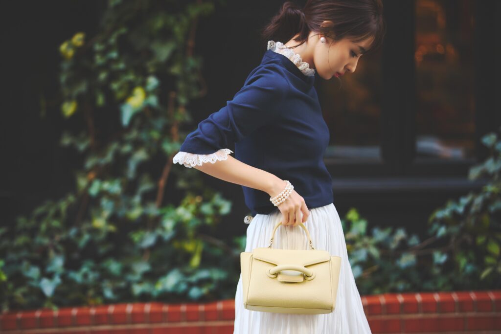 アプリでマッチングした彼とランチへ。恋を期待したくなる出会いなら、高揚感を高めてくれる甘めコーデで向かいたい。白のプリーツスカートにフリル付きニットと糖度高めの着こなしながら、白×紺の爽やか配色なら甘ったるくなりません。バッグと足元は色やモチーフがアクセントになるものを選んで、春らしい味つけを。フリル付きトップス¥19,800スカート¥25,300(ともにユナイテッドアローズ/ユナイテッドアローズ 渋谷スクランブルスクエア店)バッグ¥50,600(ヴァジック/ヴァジックジャパン)サンダル¥59,400(ネブローニ)イヤリング¥5,940ブレスレット¥29,400(ともにアビステ)