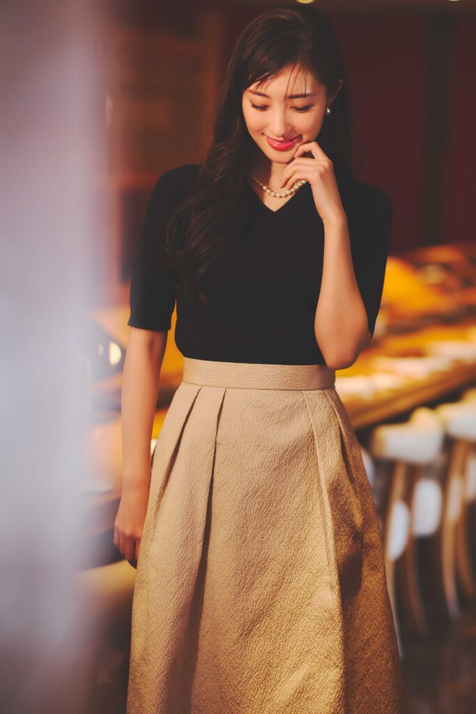 平日仕事終わりに異業種交流会へ参加。集まる人の年齢も業種もまちまちな会だけに、間違いのないキレイめコーデで挑むのが安心。首元をキレイに見せてくれるV字ニットにふんわり広がるシルエットのスカートなら、親しみやすい柔らかな印象を与えられるはず。ニット¥5,990スカート¥13,000(ともにPLST)手に持ったジャケット¥6,990(UNIQLO)バッグ¥17,600(ダイアナ/ダイアナ 銀座本店)パンプス¥35,200(ピッピシック/ベイジュ)イヤリング¥5,670ネックレス¥22,050(ともにアビステ)